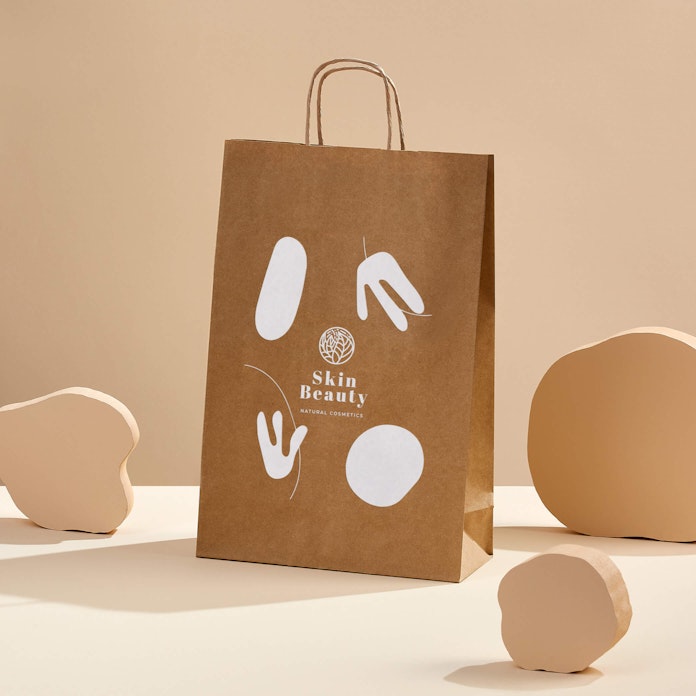 Sacs en papier imprimés entièrement naturels, bruns ou blancs, avec poignées. Réutilisables et entièrement recyclables.